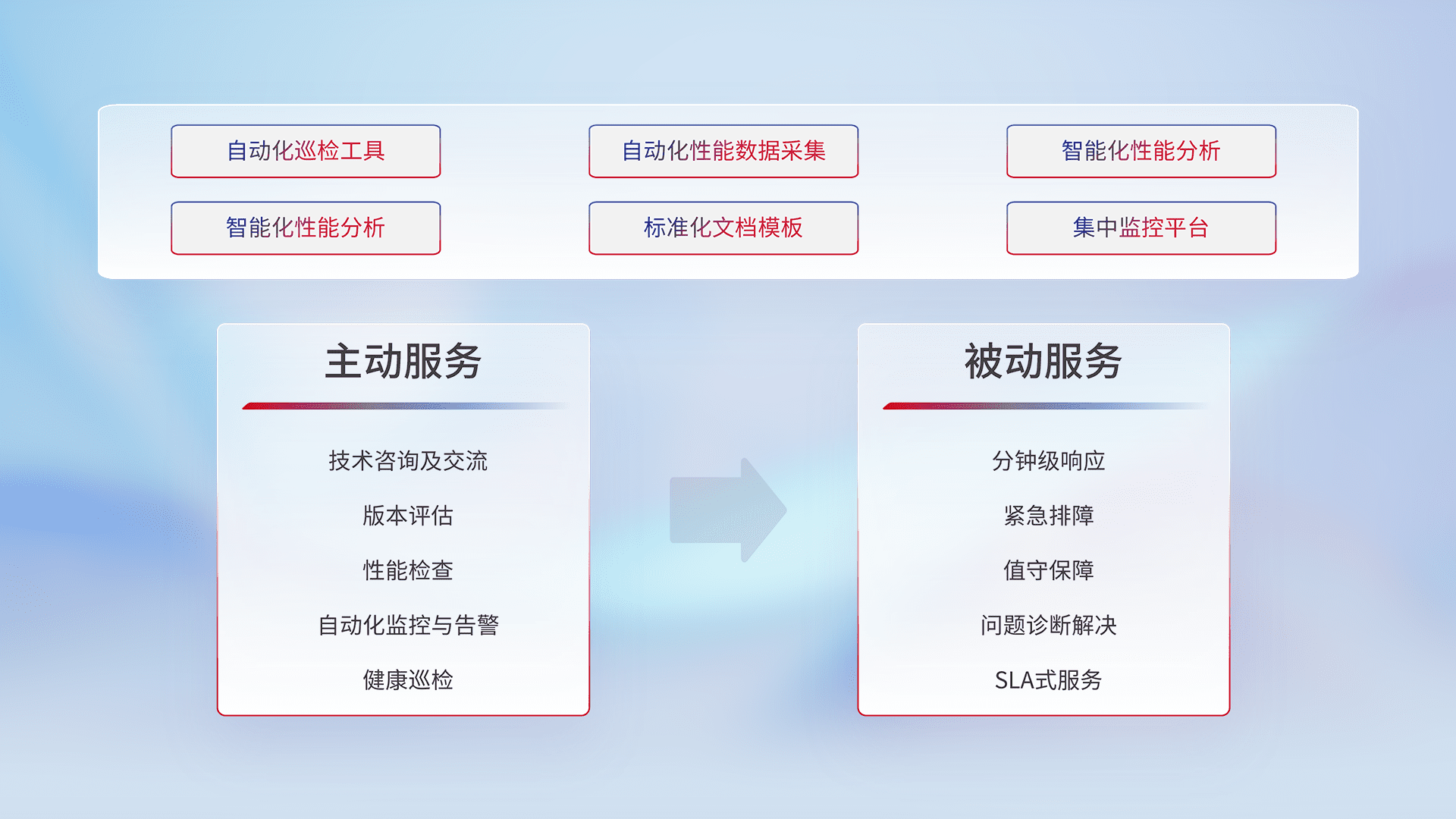 智能化工具和标准化文档,,,保障服务质量,,,,提供主动服务(包含技术咨询、、版本评估、、性能检查、、、、自动化监控与告警、、、、健康巡检)和被动服务包含(分钟级响应、、、、紧急排障、、值守保障、、问题诊断解决、、SLA服务)。。。。